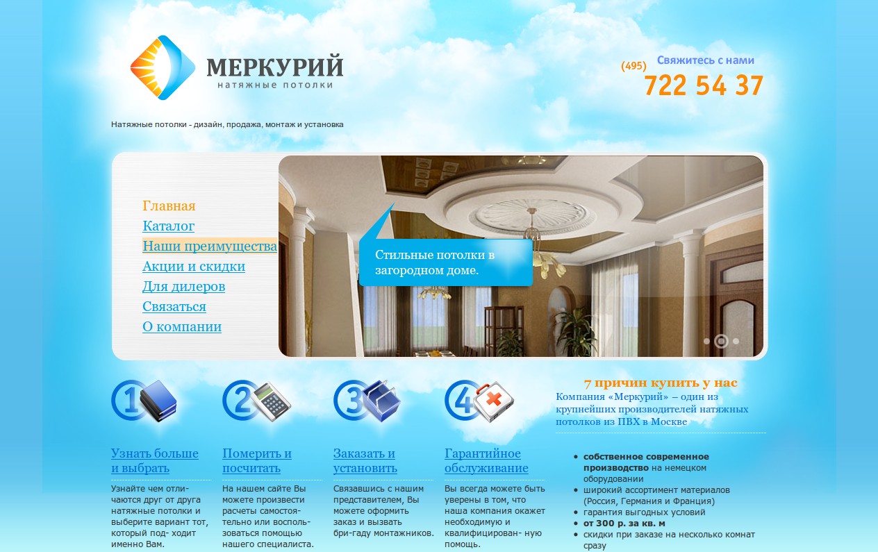 Наша компания «Меркурий» осуществляет производство натяжных потолков на собственном немецком оборудовании. Заказать натяжные потолки нашего изготовления вы можете по телефону +7 (495) 722-54-37. В нашем каталоге вы сможете ознакомиться со всем ассортиментом бесшовных натяжных потолков, предлагаемых к продаже.